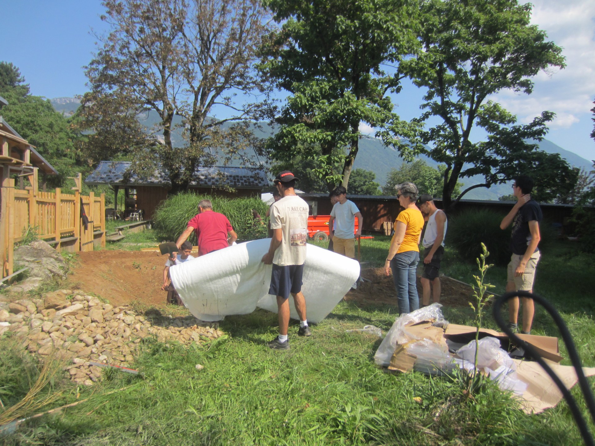 Vendredi 16 juin, les élèves, des jeunes de CAPA (Certificat d’Aptitude Professionnel Agricole) JP (Jardinier – Paysagiste) 1ère année et les apprentis de BTS AP (Aménagements Paysagers) étaient à la manœuvre, suivant les consignes de Philippe Lamour et Catherine Steyer, deux enseignants du lycée, pour reprofiler le trou, poser le feutre de protection et la bâche EPDM par-dessus (EPDM pour Ethylène-Propylène-Diène Monomère). La prochaine étape consistera à mettre en eau et à végétaliser le bassin, une fois les clôtures posées.