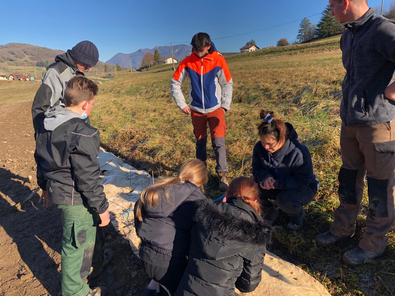 Durant 3 jours, les élèves de Terminale Aménagement Paysager (AP) ont participé à la plantation d'une haie champêtre sur différents terrains agricoles de Massignieux de Rives, dans l'Ain. Le chantier a été suivi par le syndicat du haut Rhône et encadré par les enseignants Mr Réa et Mr Lamour.