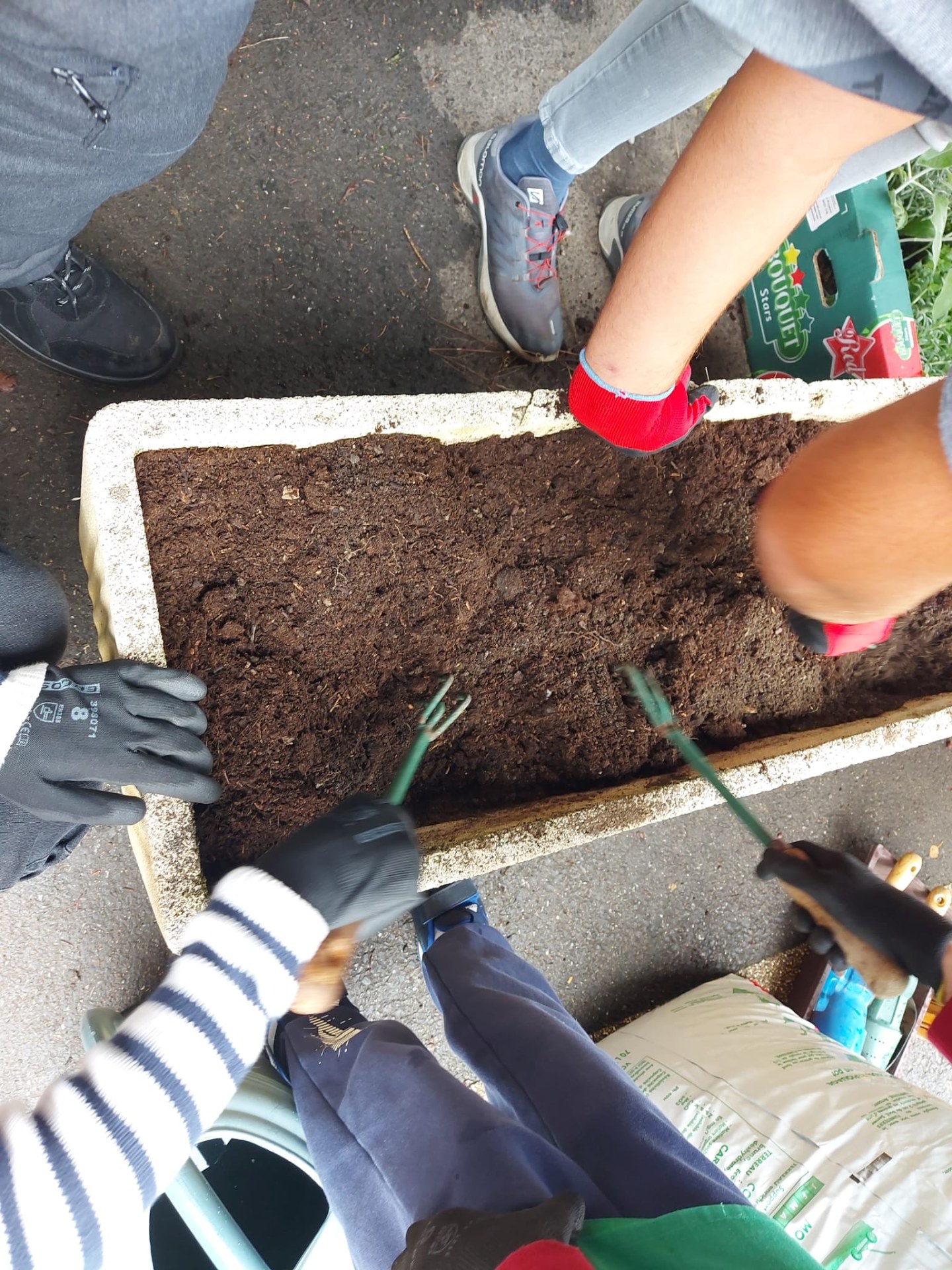 Élie a proposé un loto des végétaux qu'il avait lui-même fabriqué, Abigaëlle était venue avec peintures, pinceaux et feuilles de végétaux pour leur permettre de réaliser du "végét'art", quant à Flora, elle a été le pilote de l'activité "plantation de vivaces et d'aromatiques".
