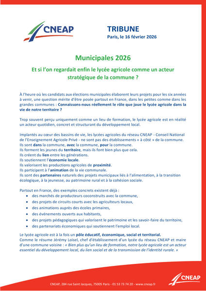 À l’approche des municipales 2026, le CNEAP invite les candidats et futurs élus à regarder le lycée agricole non pas comme une structure parmi d’autres, mais comme un allié naturel pour construire des politiques locales ambitieuses, durables et profondément ancrées dans la réalité du terrain.