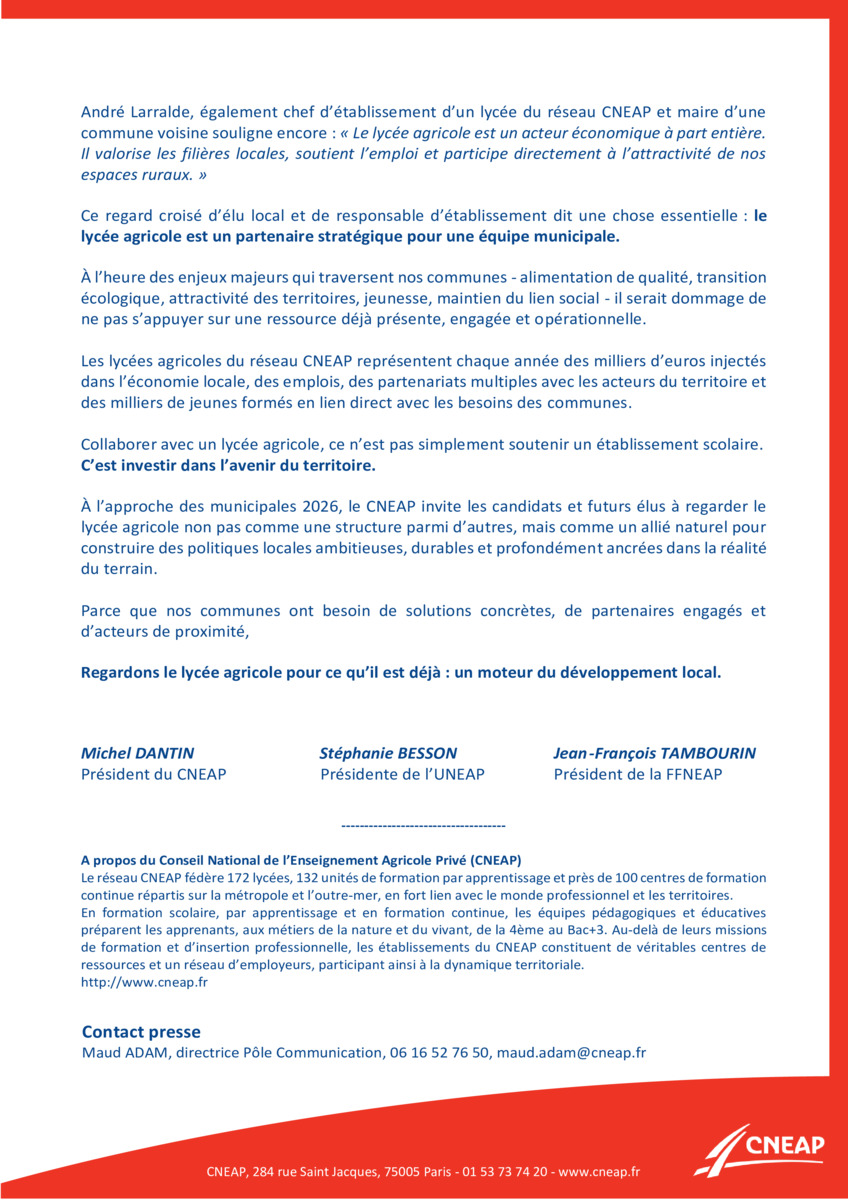 Comme le résume Jérémy Loisel, chef d’établissement d’un lycée du réseau CNEAP et maire d’une commune voisine : « Bien plus qu’un lieu de formation, notre lycée agricole est un acteur essentiel du développement local, du lien social et de la transmission de l’identité rurale. »