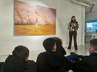 Devant chaque tableau, la médiatrice a laissé les jeunes décrire ce qu’ils voyaient et s’exprimer sur leurs ressentis et leurs interprétations. En rappelant le parcours de Coline, avec ses études cinématographiques, elle a invité les élèves à regarder de plus près les jeux de lumière et le choix des angles de vues. Les élèves étaient surpris de voir l’inaction des personnages et leur manque d’instinct de survie, dos aux dangers qui les guettent, comprenant très bien la métaphore du naufrage de notre société, face aux changements climatiques.