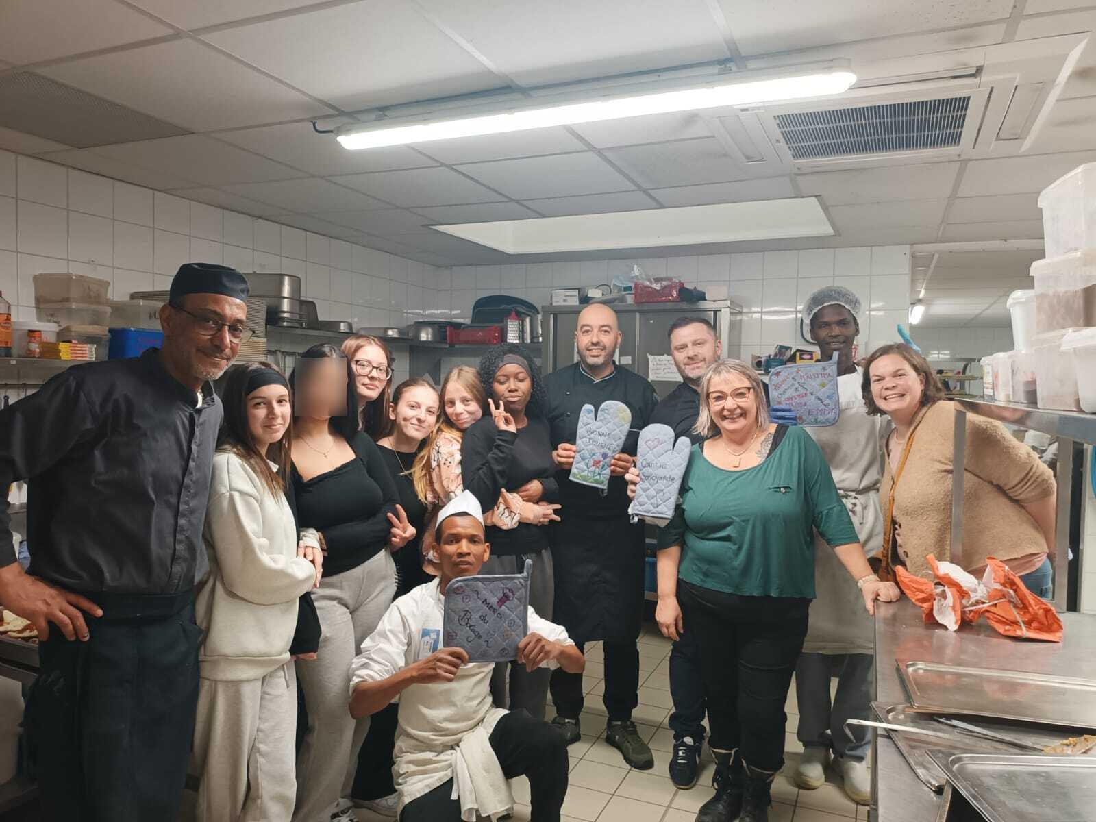 Au final, les jeunes ont participé à la conception des repas, elles ont travaillé avec Jérôme LECHIFFRE, chef à la Maison des Pêcheurs, George, un ancien cuisinier de l'IME Saint Louis Du Mont, Ibrahima, un super apprenti, Sofiane BOUMATI, ancien chef de cuisine à l’aéroport de Voglans, aujourd'hui à demeure à La Cantine Savoyarde, mais aussi Christine, une bénévole hors pair, motivatrice de troupe ! Ils ont aussi pu faire dédicacer le livre de Hassen BENNOUI, La Galoppaz, ou la France des sans-papiers. Pour remercier l'équipe, les jeunes ont remarqué qu'il manquait quelques maniques en cuisine, un joli cadeau pour rester un peu plus longtemps "avec eux" en cuisine... et ont préparé quelques petits messages doux et chocolatés pour les bénéficiaires.